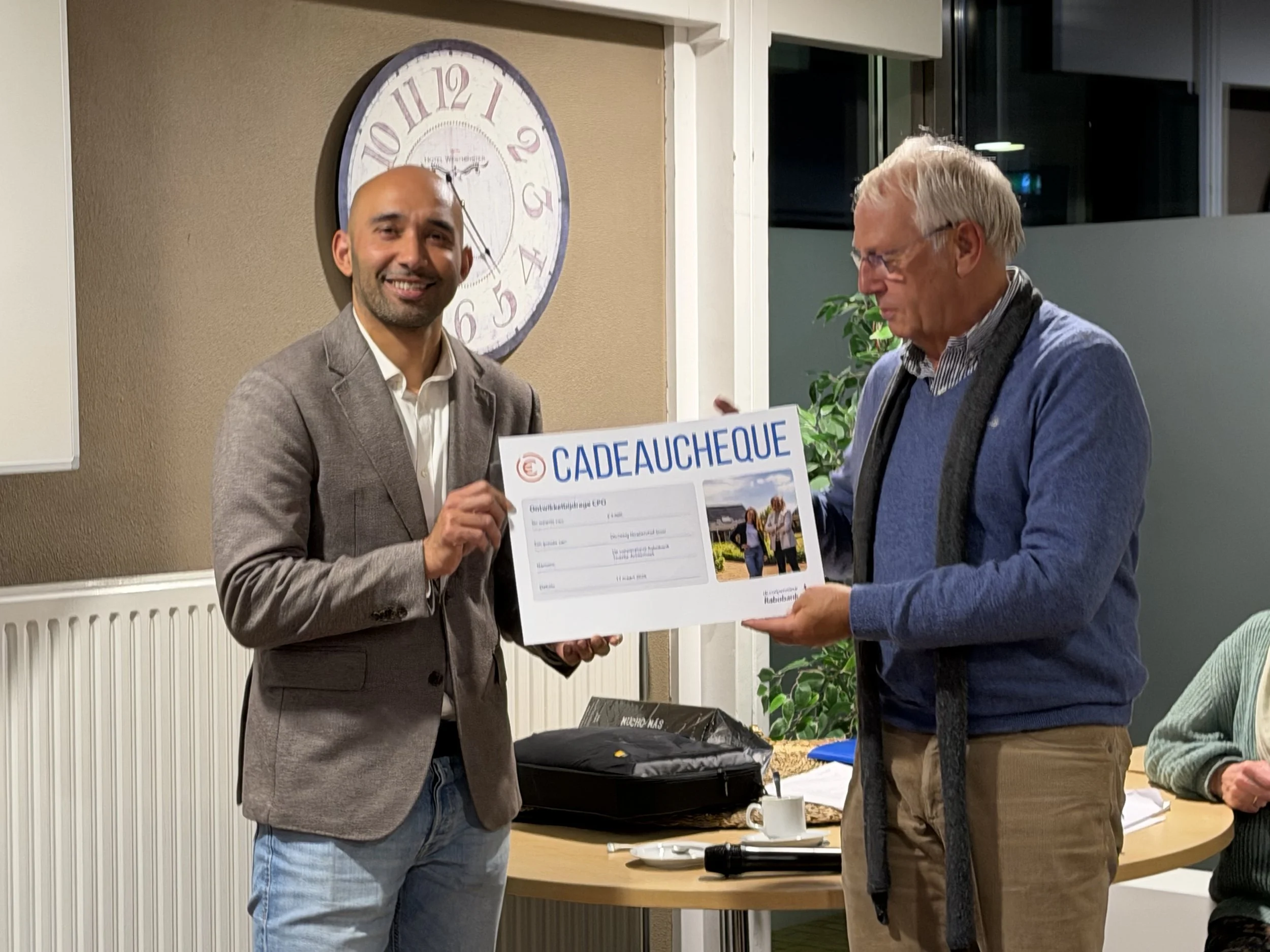 Tot slot volgde een bijzondere verrassing: als blijk van steun ontving de stichting een cheque ter waarde van € 5.000. De penningmeester nam deze met veel enthousiasme in ontvangst.